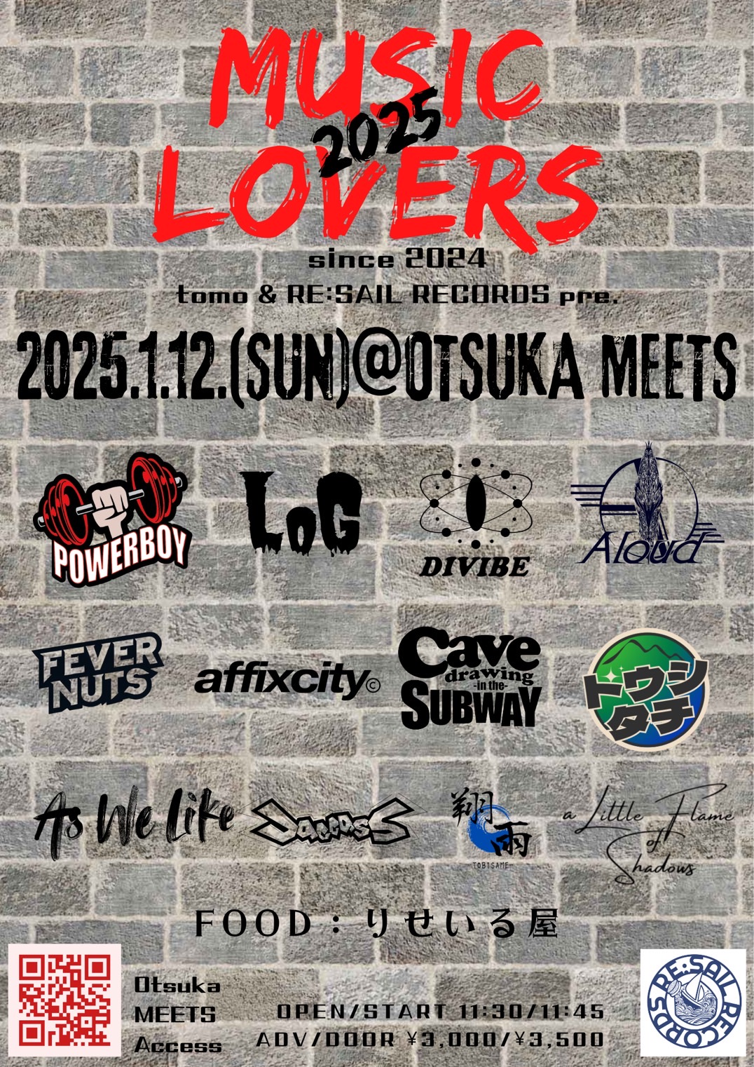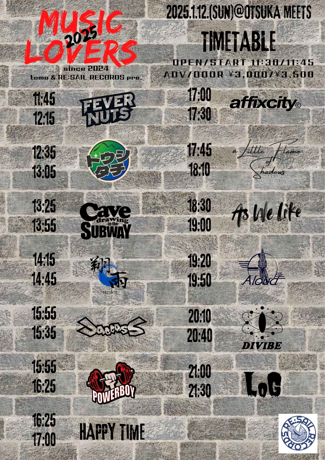 出演者 affixcity Aloud As We Like Cavedrawing in the SUBWAY DIVIBE FEVER NUTS Jaccass LoG POWERBOY ドウシタチ 翔雨 a little flame of shadows food りせいる屋 OPEN 11:30 / START 11:45 ADV¥3000(+Drink) / DOOR¥3500(+Drink)