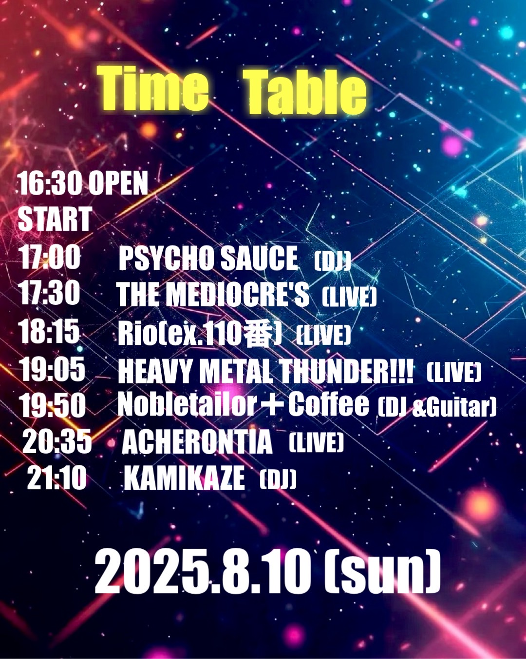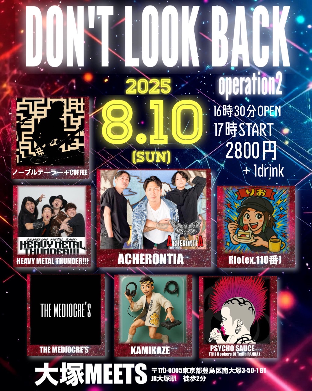 出演者 ACHERONTIA HEAVY METAL THUNDER!!! Rio(ex.110番) THE MEDIOCRE'S KAMIKAZE PSYCHO SAUCE(THE Hookers,DJ Team PANDA) ノーブルテーラー+Coffee OPEN 16:30 / START 17:00 TICKET ¥2800(+Drink)