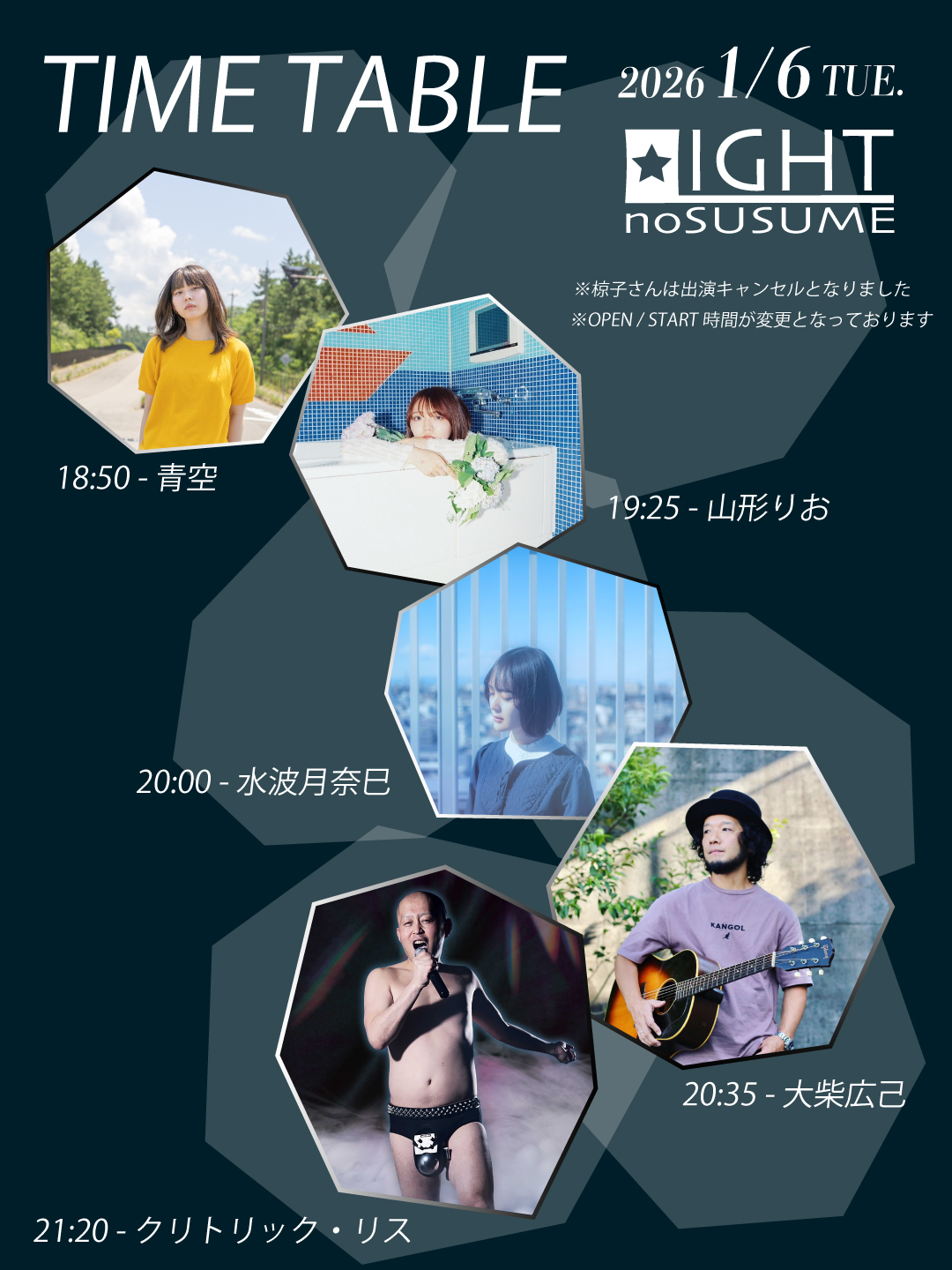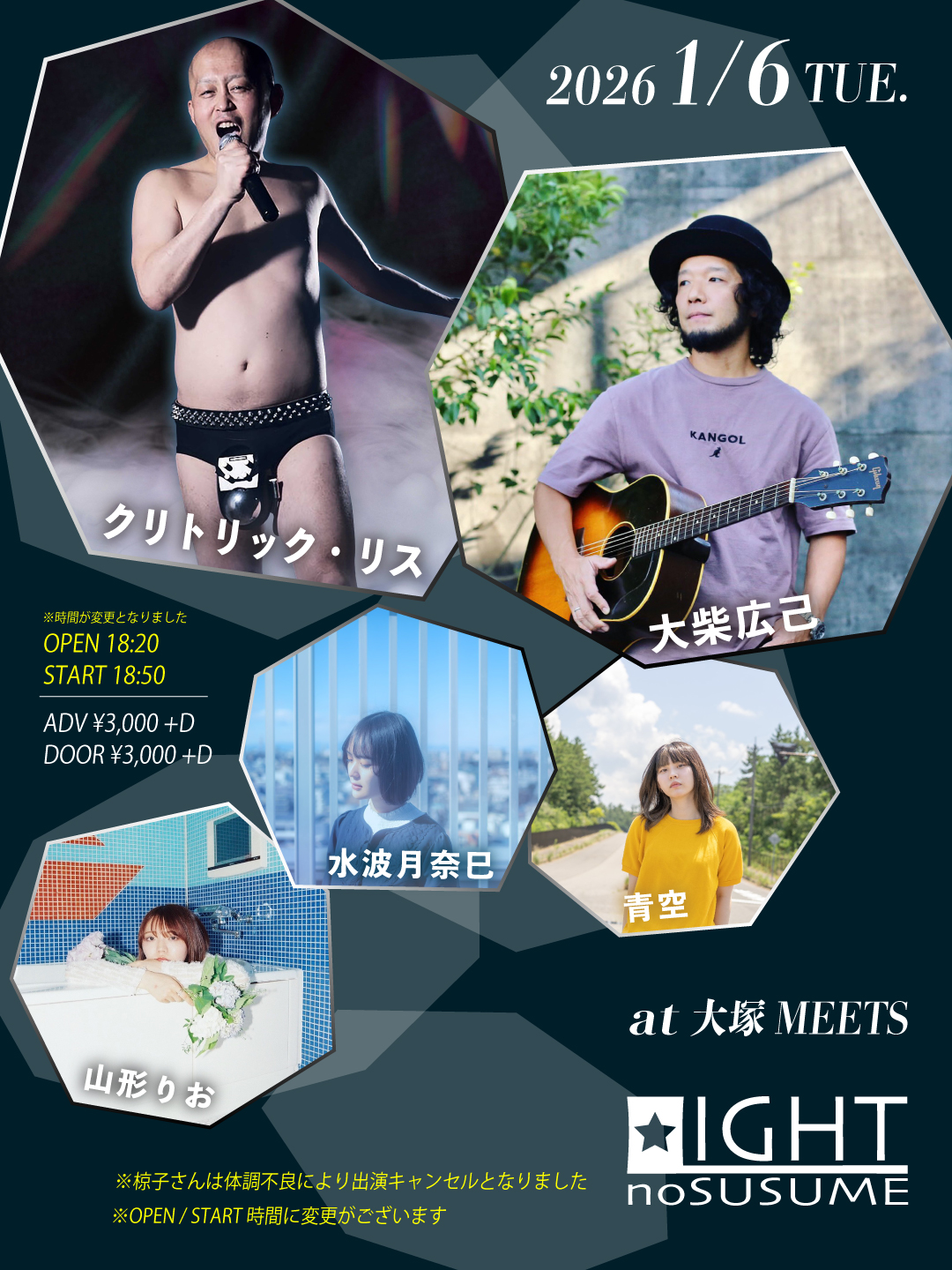 ※出演予定でした「椋子」さんは、体調不良により出演キャンセルとなりました。それに伴い、OPEN / START時間が変更となっております。