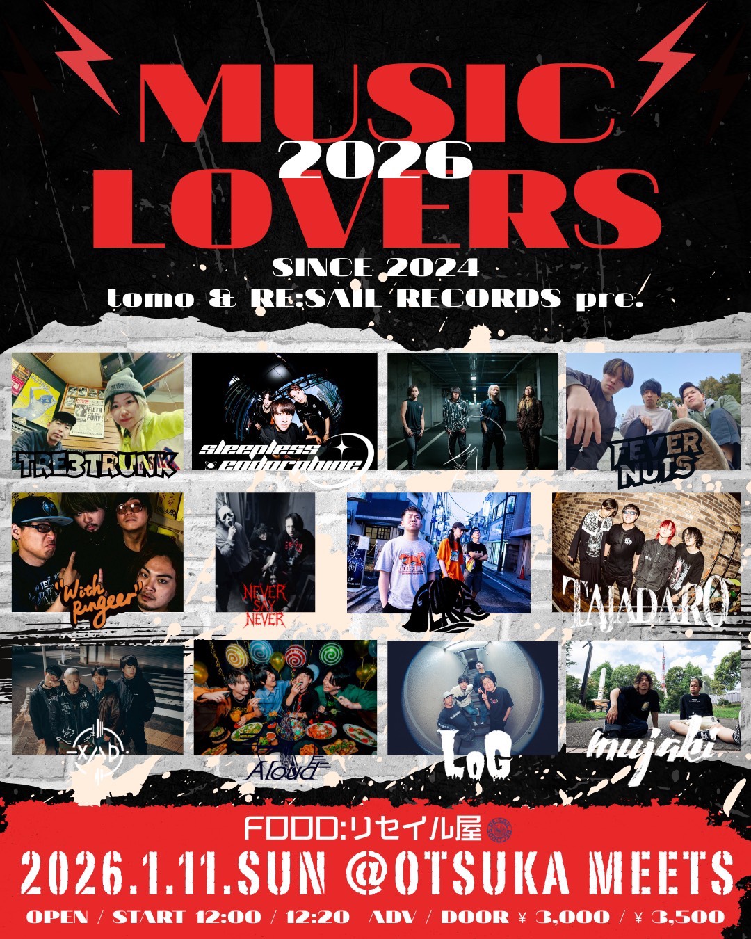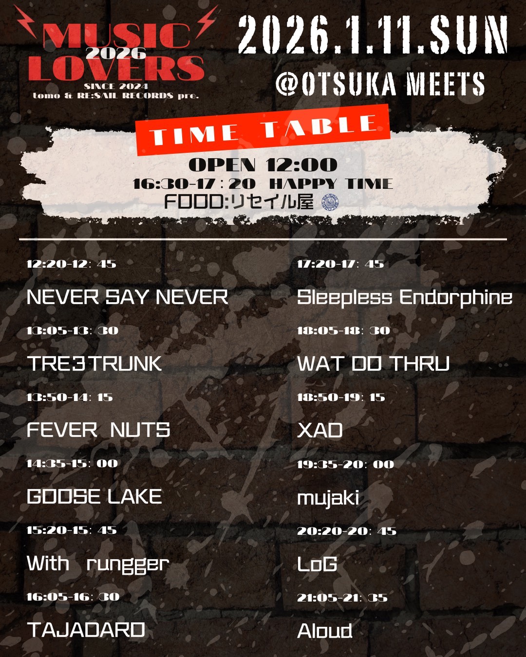 出演者 Aloud FEVER NUTS LoG mujaki Sleepless Endorphine TAJADA RO TRE3TRUNK WithRungeer WAY DO THRU GOOSE LAKE NEVER SAY NEVER XAD -FOOD- りせいる屋 OPEN 12:00 / START 12:30 ADV¥3000(+Drink) / DOOR¥3500(+Drink) ロック / パンク / オルタナティブ